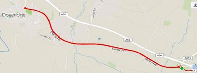 Start at lighting column No.105138 by field gate on A5132, Hilton. Proceed to roundabout and turn left up the slip road to join A50 Westbound. Proceed across three roundabouts (Sudbury, Uttoxeter Racecourse and MacDonalds) to take slip road at the JCB interchange. At the roundabout at the top of the slip road turn right, crossing above the A50 to the next roundabout. Here turn right to take slip road onto A50 Eastbound (beware as road turns back on itself!). Rejoin A50 (12.5 miles). Retrace the route on A50 Eastbound across three roundabouts and take slip road A516 Derby West/Etwall. At Willowpit island take 2nd exit onto A516 to finish approximately 50 yards after the right hand turn to Etwall, 20 yards before A516/M1 green road sign. (25.015 miles).